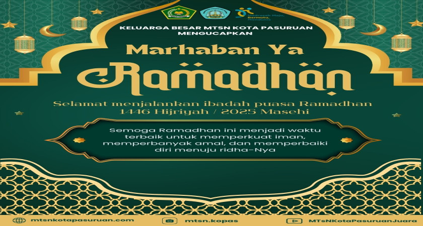 Keluarga besar MTsN Kota Pasuruan mengucapkan Selamat Menjalankan Ibadah Puasa Ramadan 1446 Hijriah/2025 Masehi.