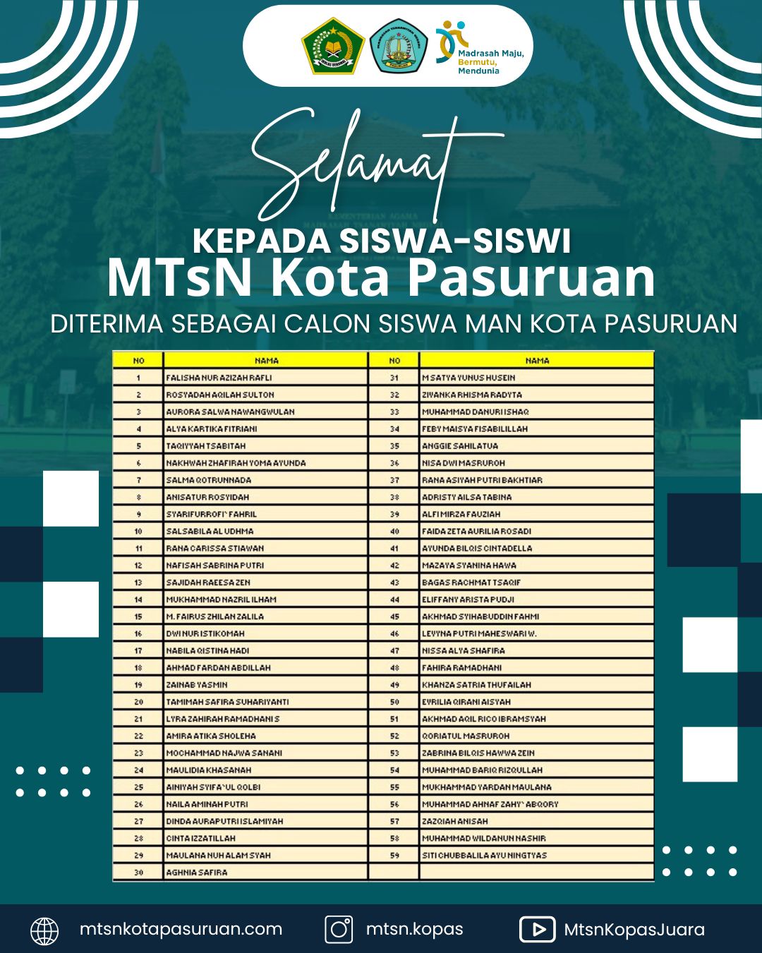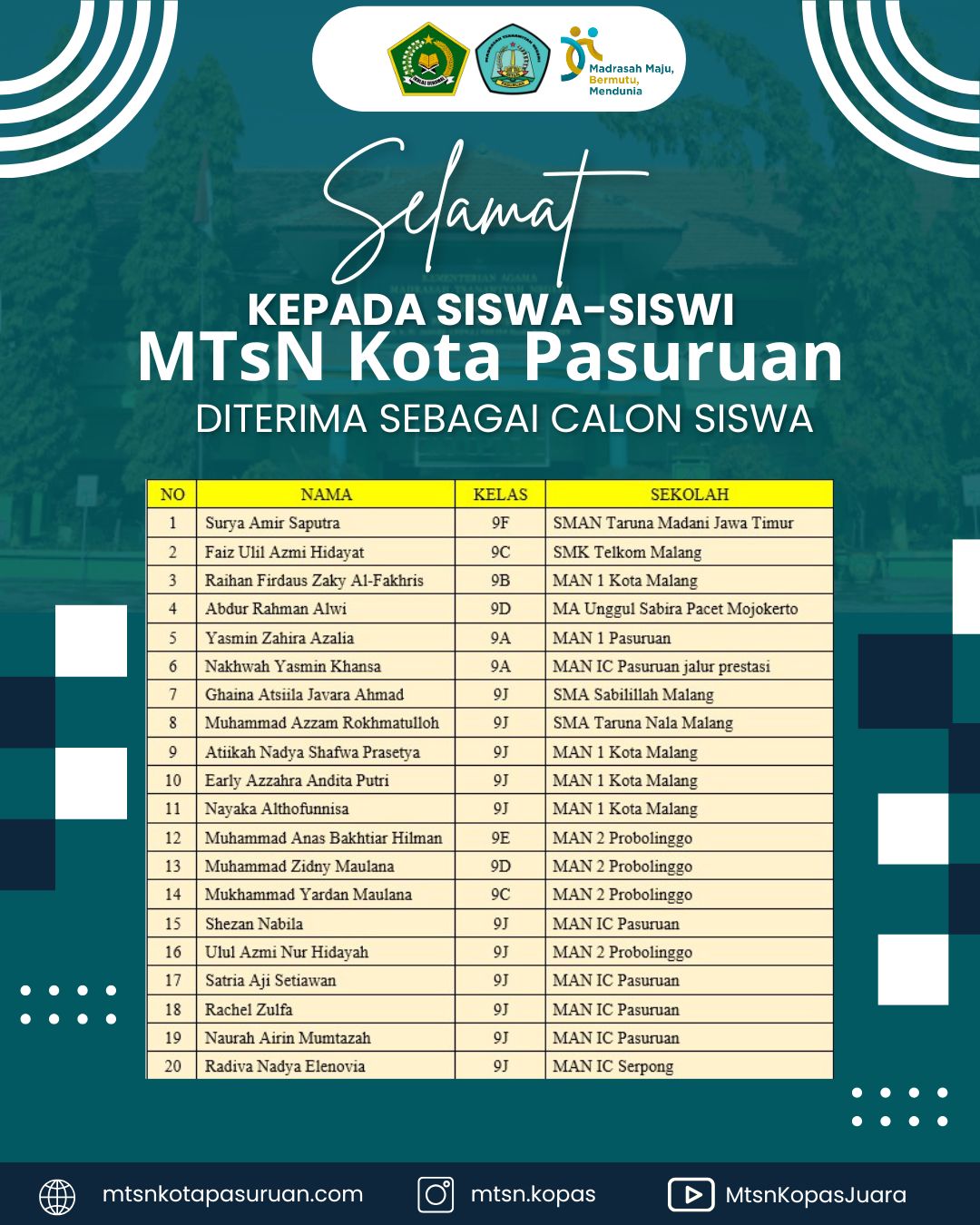 MTsN Kota Pasuruan mengucapkan SELAMAT kepada seluruh alumni yang telah berhasil lolos dan diterima di sekolah lanjutan tingkat atas (SMA/SMK/MA) pilihan, baik melalui jalur prestasi maupun tes seleksi.
