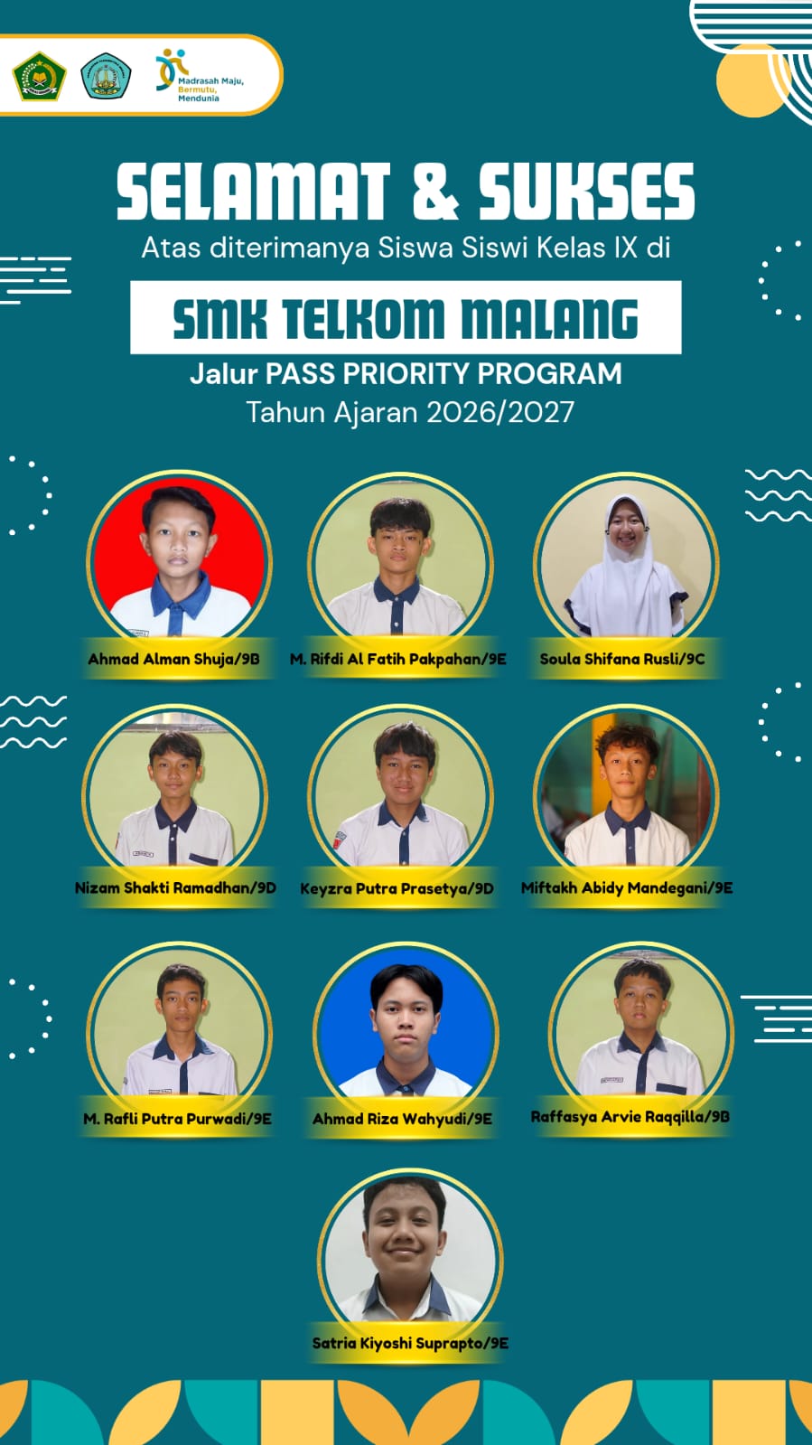 "Ini adalah kabar gembira yang luar biasa. SMK Telkom dikenal memiliki standar yang sangat tinggi dalam mencetak lulusan yang siap kerja di era digital. Diterimanya sebelas anak kita melalui jalur prioritas adalah indikator bahwa kompetensi dasar, terutama di bidang sains dan teknologi, yang mereka dapatkan di madrasah ini sudah sangat mumpuni," kata Drs. Nur Edi Samani, M.Pd.