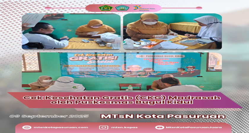 PASURUAN – Kesehatan adalah modal utama dalam menuntut ilmu dan meraih prestasi. Sebagai wujud kepedulian terhadap kesejahteraan siswa-siswi, MTsN Kota Pasuruan sukses menyelenggarakan kegiatan Cek Kesehatan Gratis (CKG) bagi seluruh peserta didik, bekerja sama dengan tim medis profesional dari Puskesmas Bugul Kidul pada 9 September 2025.
