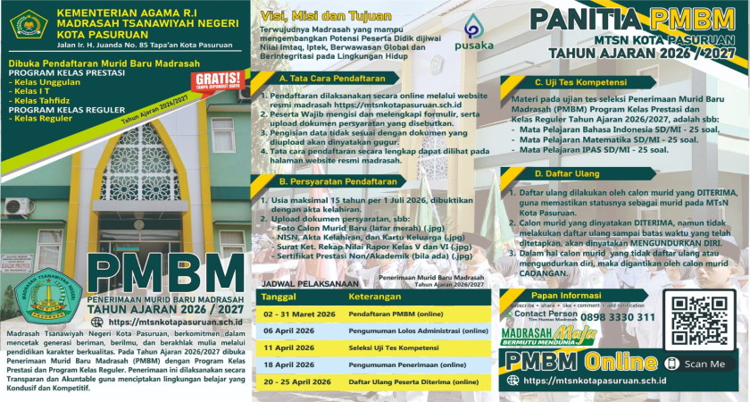 Penerimaan Murid Baru MTsN Kota Pasuruan Segera Dibuka, persiapkan diri kalian dan segera daftar pada tanggal yang telah ditetapkan. Cek Brosurnya dibawah ini ya!